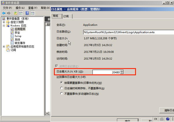 打开 控制面板 > 管理工具 > 事件查看器,配置 应用日志、系统日志、安全日志 属性中的日志大小,以及设置当达到最大的日志尺寸时的相应策略。